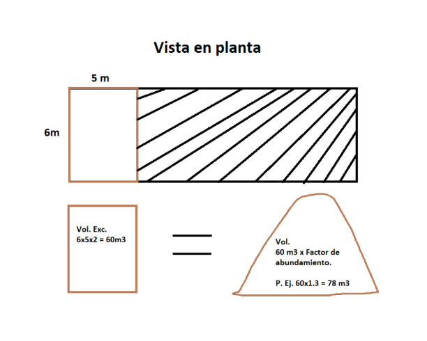 Como se muestra en la imagen para una vista en planta de un terreno, la excavación puede medirse como el área del terreno por la profundidad del mismo, para el caso 6x5x2. No obstante ese es material compacto, si se sacan los granos tienden a dispersarse un poco, se acumulan vacíos entre las partículas y en general hay una expansión del material. (Es decir, aunque sabemos que son las mismas partículas ahora están más separadas por los vacíos de aire que se integran. De la práctica ya se han establecido factores de abundamiento para cada material, pues no es lo mismo unos granos finos a unas gravas en virtud del espacio de aire que puede quedar entre ellas).
