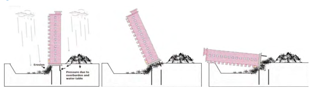 Para el caso que estamos estudiando fue lo que ocurrió. Por un lado se hizo la excavación, por el otro se colocó el material excavado que alcanzó hasta 10 m de altura, lo que significó un peso sobrepeso adicional creando una profunda diferencia de presiones.